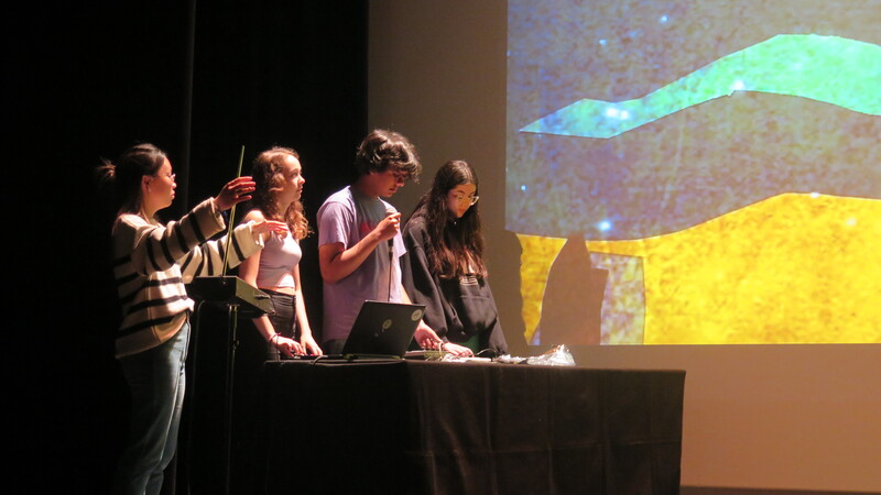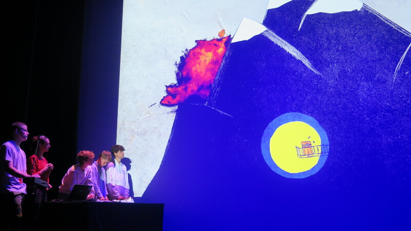 Plusieurs tableaux s’enchainent, des vidéos en stop-motion réalisées par les élèves. Pendant ce temps, certains d’entre eux sont sur scène, au niveau d’une table remplie d’instruments particuliers qui leurs permettent de rajouter du son en direct. Chaque son est distinct, spatialisé dans la salle. Pour les autres, dans les travers, pas facile de garder le silence ; c’est un véritable apprentissage ! Entre chaque tableau, les élèves entrent en scène pour des transitions rythmées.